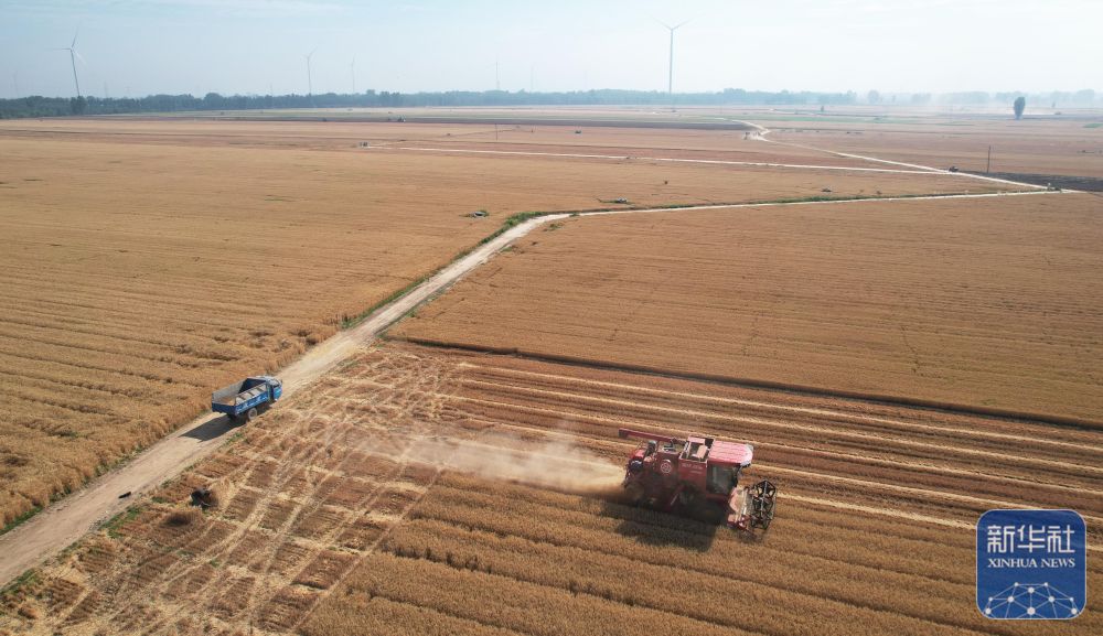 ↑6月5日,山东省滨州市滨城区秦皇台乡的农民驾驶收割机收获小麦。新华社发(初宝瑞 摄)