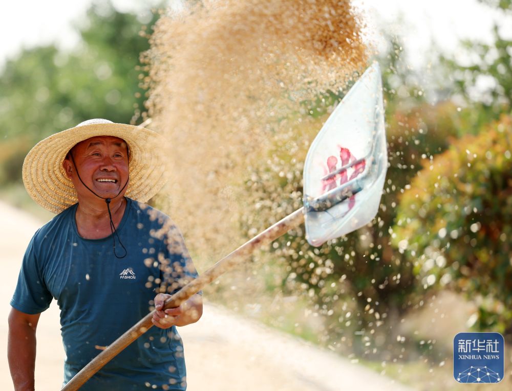 ↑6月4日,山东省临沂市郯城县郯城街道农民扬晒收获的小麦。新华社发(张春雷 摄)