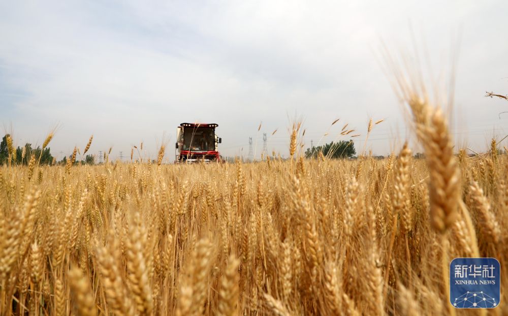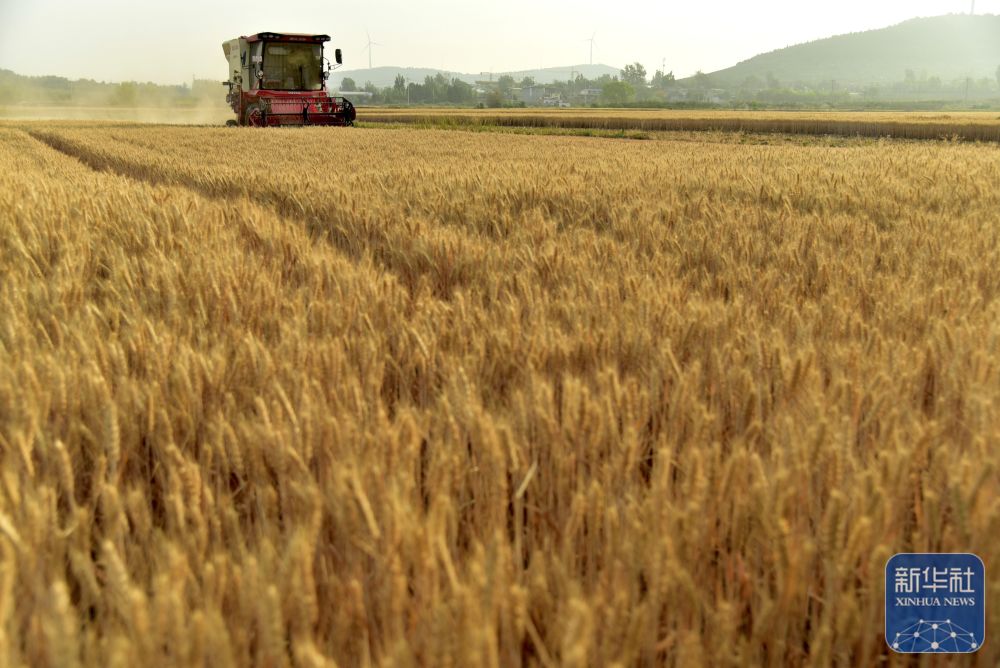 ↑6月4日,农民驾驶农机在山东省淄博市高青县黑里寨镇抢收小麦。新华社发(张维堂 摄)