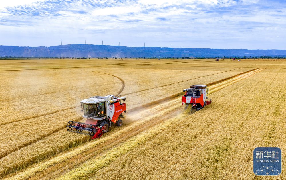 ↑6月4日,收割机械在山西省芮城县东垆乡黄河滩涂远鹏智慧农场收割小麦。新华社发(薛俊 摄)
