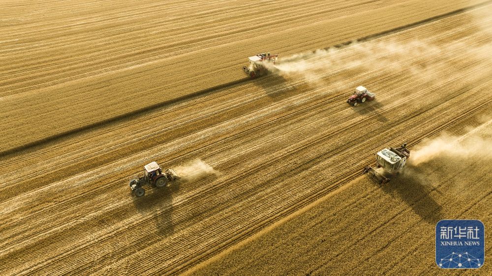 ↑6月4日,在河南省商丘市梁园区李庄镇潘堂村志诚种植农民专业合作社,农机手操作收割机、秸秆还田机、玉米精量播种机作业(无人机照片)。新华社发(李恒 摄)