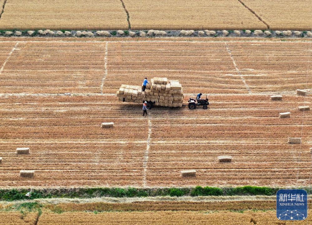↑6月5日,农民在山东省聊城市茌平区杜郎口镇北街村的麦田里将粉碎的小麦秸秆装车(无人机照片)。新华社发(马红坤 摄)