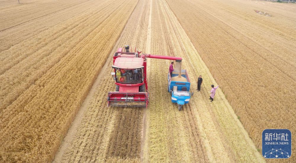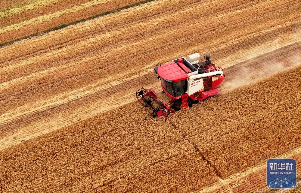 ↑6月5日,在河南省武陟县嘉应观镇吴小营村的一处麦田,村民驾驶农机收获小麦(无人机照片)。新华社发(王琳锋 摄)