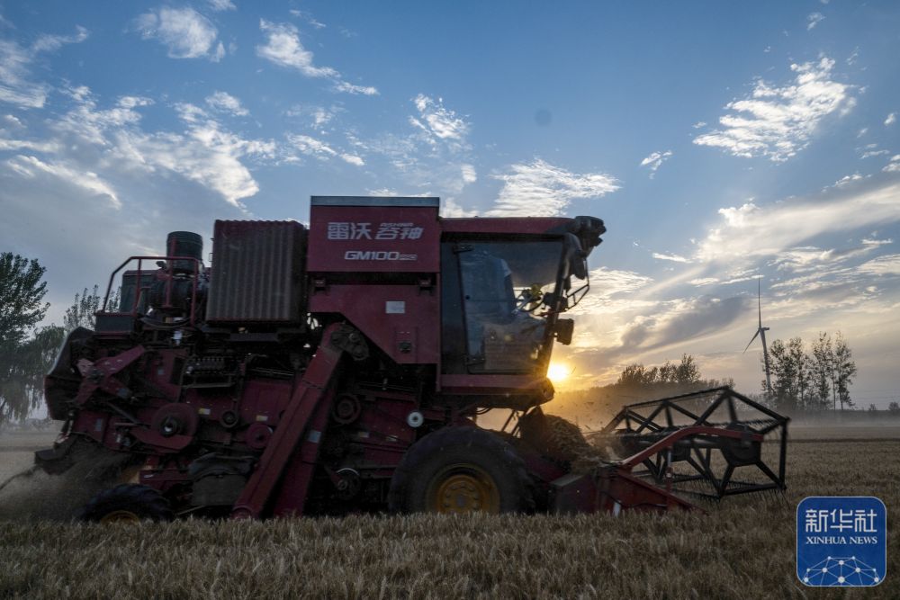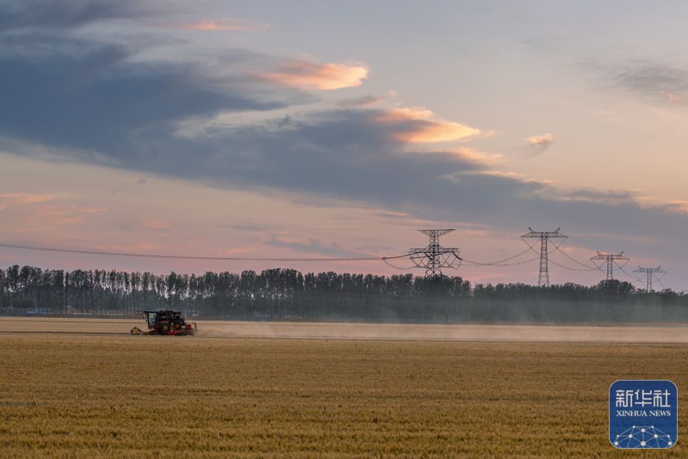 ↑6月5日,在河南省商丘市夏邑县会亭镇崔楼村,收割机伴着夕阳收获小麦。新华社发(王高超 摄)