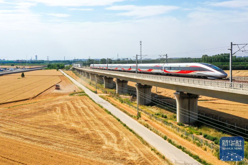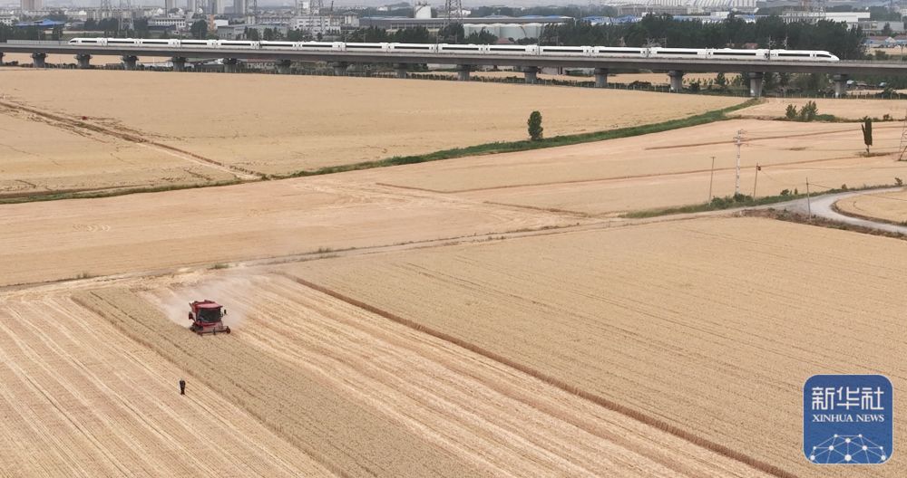 ↑6月5日,山东省邹平市长山镇前栗村农民驾驶农机收割小麦,列车从麦田旁经过(无人机照片)。新华社发(董乃德 摄)