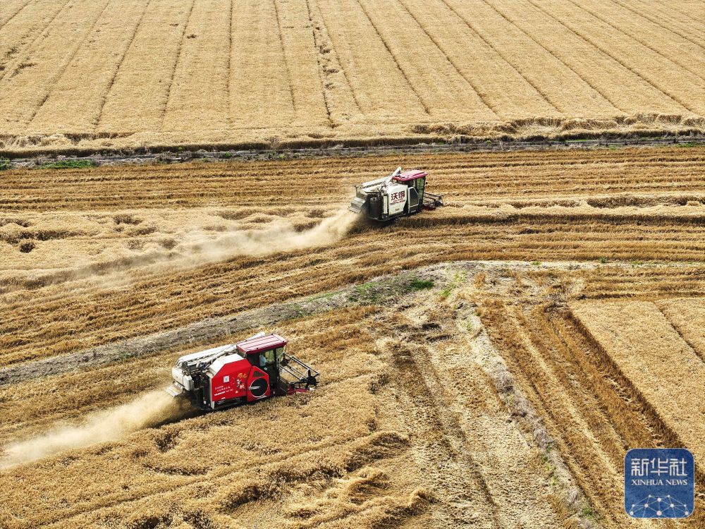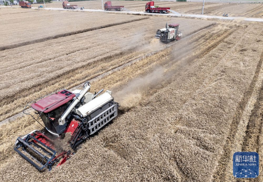 ↑6月5日,在江苏省泰兴市延令街道三阳村,农机手驾驶收割机收割小麦(无人机照片)。新华社发(顾继红 摄)