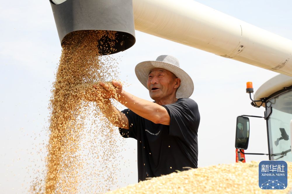 ↑6月5日,在山东省滨州市博兴县纯化镇西王文村,农民查看收获的小麦。新华社发(陈彬 摄)