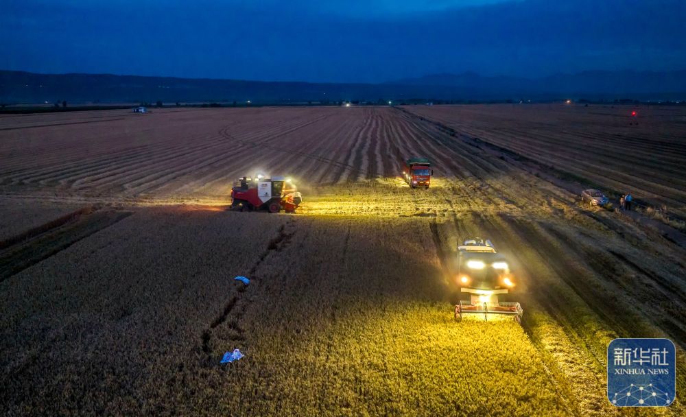 ↑6月4日晚,在山西省运城市芮城县东垆乡黄河滩涂上,农民驾驶收割机抢收小麦。新华社发(薛俊 摄)