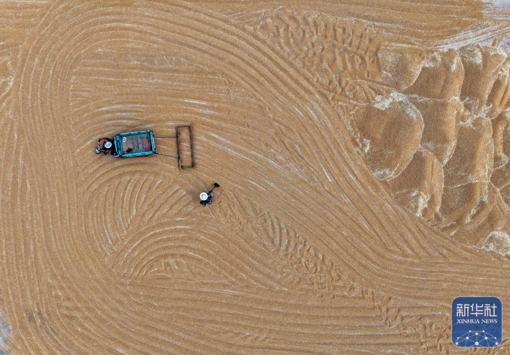 ↑6月5日,山东省枣庄市市中区西王庄镇天齐庙村农民晾晒收获的小麦(无人机照片)。新华社发(孙中喆 摄)