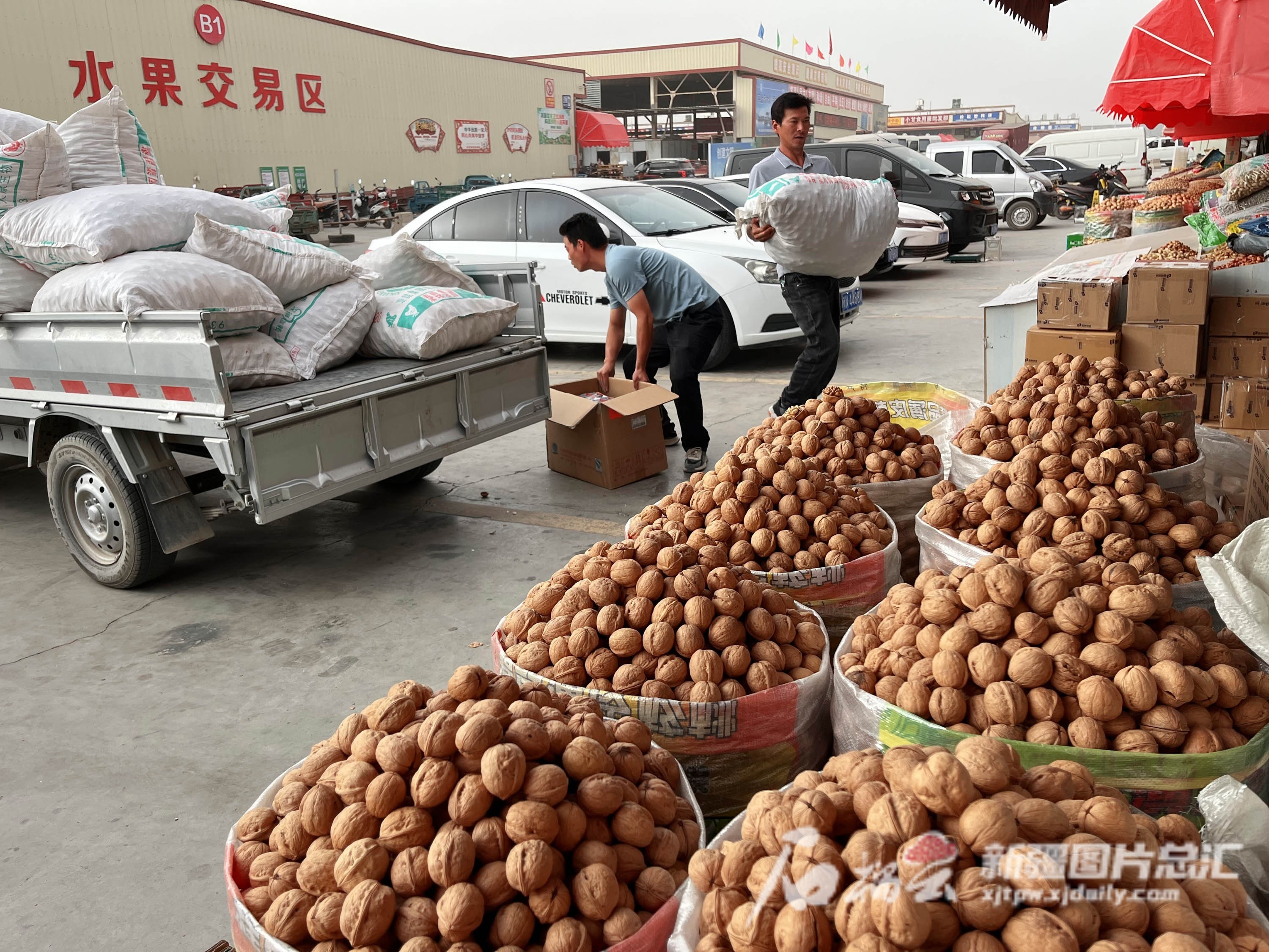 9月16日,新疆果业农产品交易中心商户在搬运阿克苏核桃。
