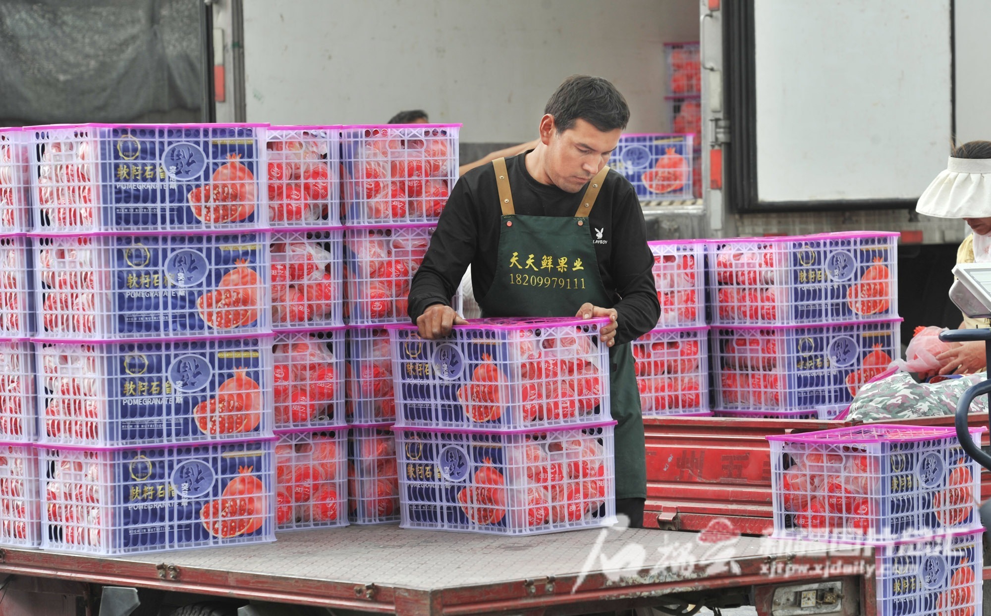 9月16日,工人在新疆果业农产品交易中心装运石榴。