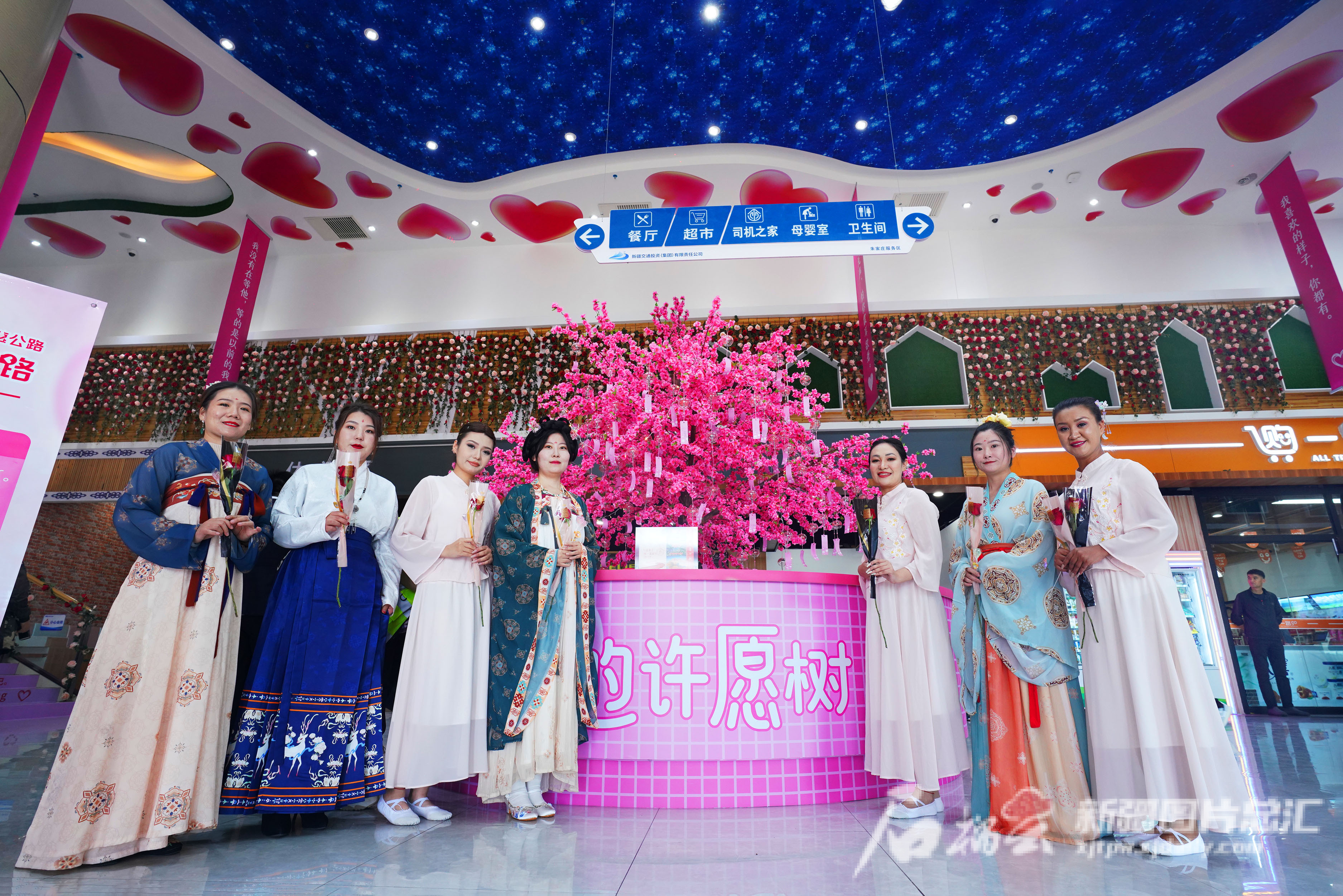 9月27日,“S20爱情公路”朱家庄“爱情博物馆示范服务区”,礼仪人员在许愿树前迎接进入服务区的司乘人员,遇到情侣会给他们赠送鲜花等礼品。