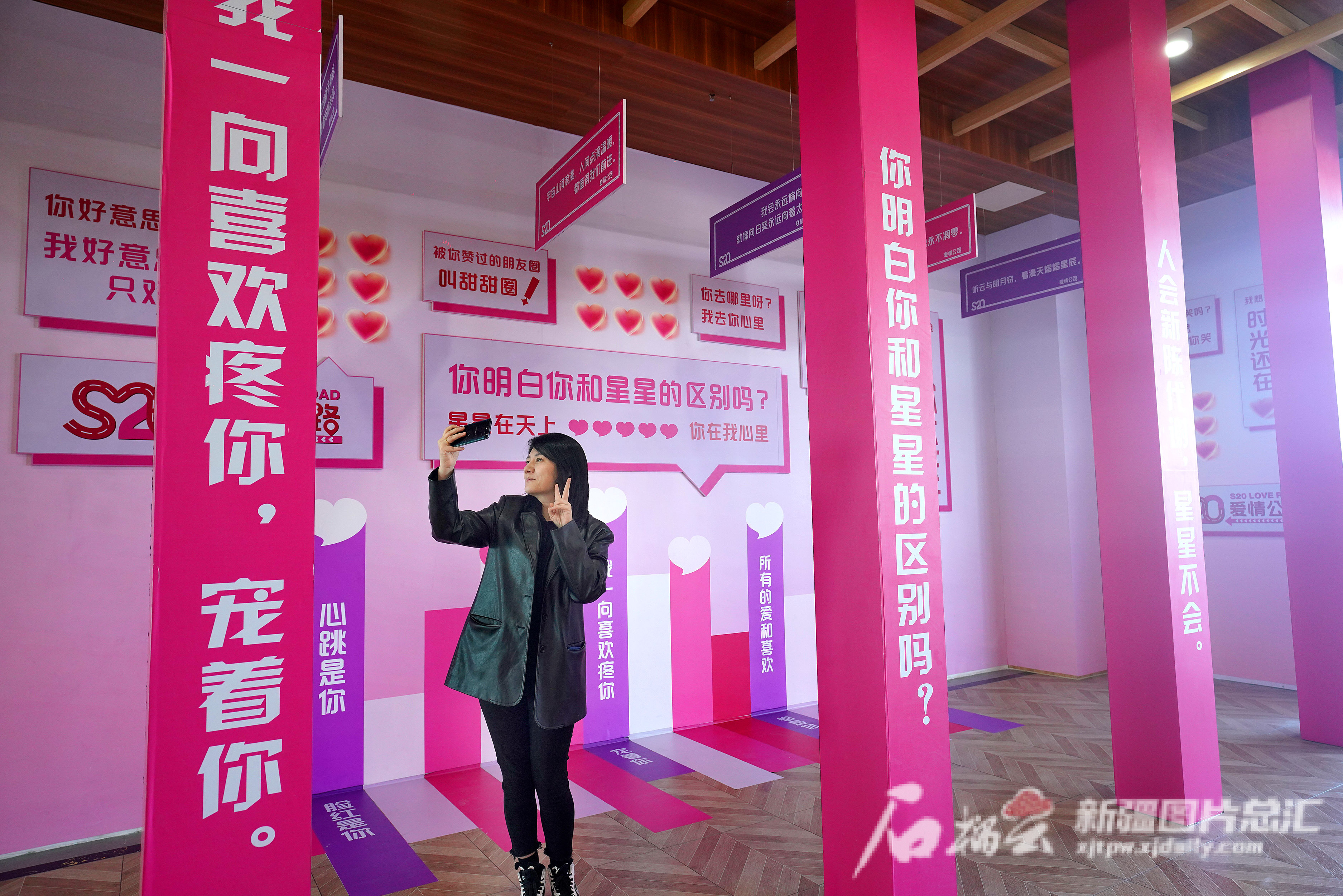 9月27日,“S20爱情公路”朱家庄“爱情博物馆示范服务区”,游客买尔哈巴在自拍留影。