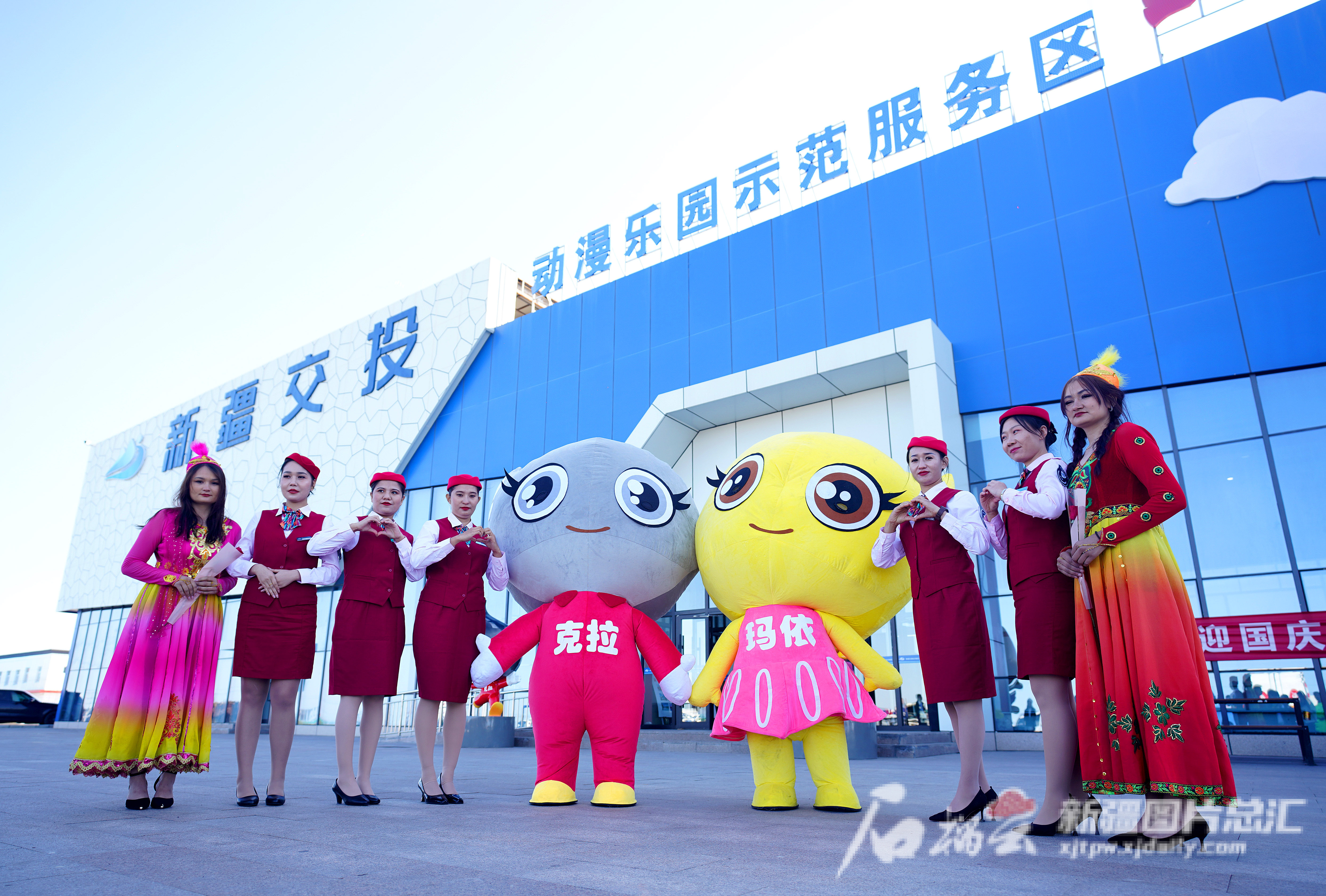 9月27日,“S20爱情公路”121团动漫乐园示范服务区,“克拉”和“玛依”以及这里的工作人员欢迎远方游客到来。