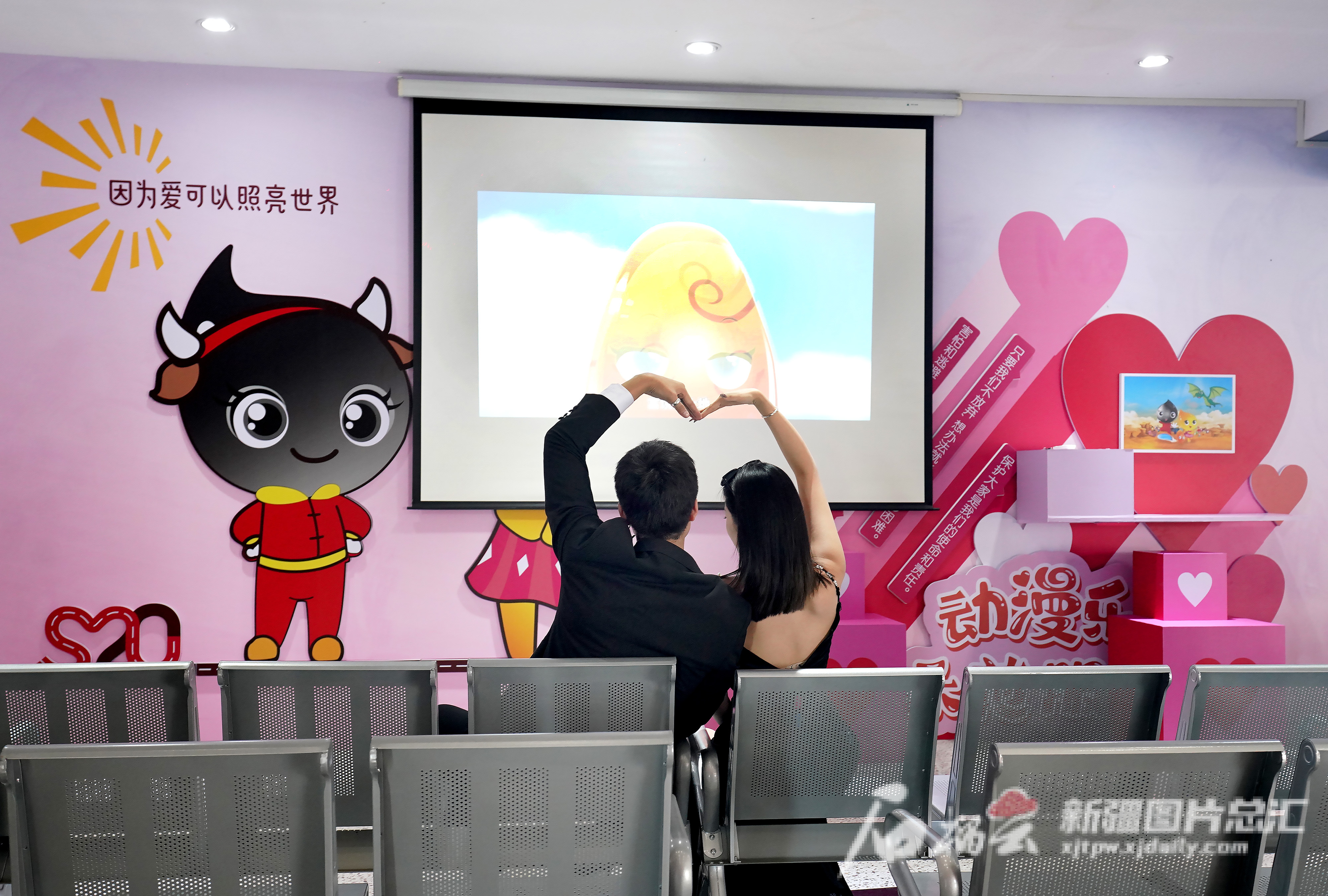 9月27日,“S20爱情公路”121团动漫乐园示范服务区,一对情侣在打卡拍照。