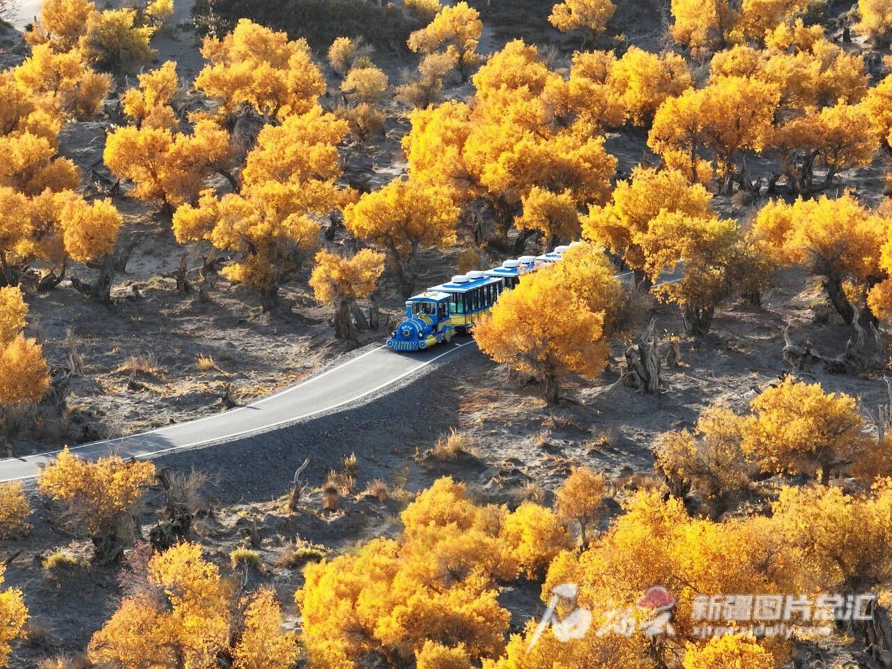 载满游客的小火车穿梭在伊吾胡杨林生态园景区,阳光下的金黄色叶子炫目多姿,游客们徜徉其中,感受着无限风光,宛若一幅艳丽画卷。刘萌萌 摄