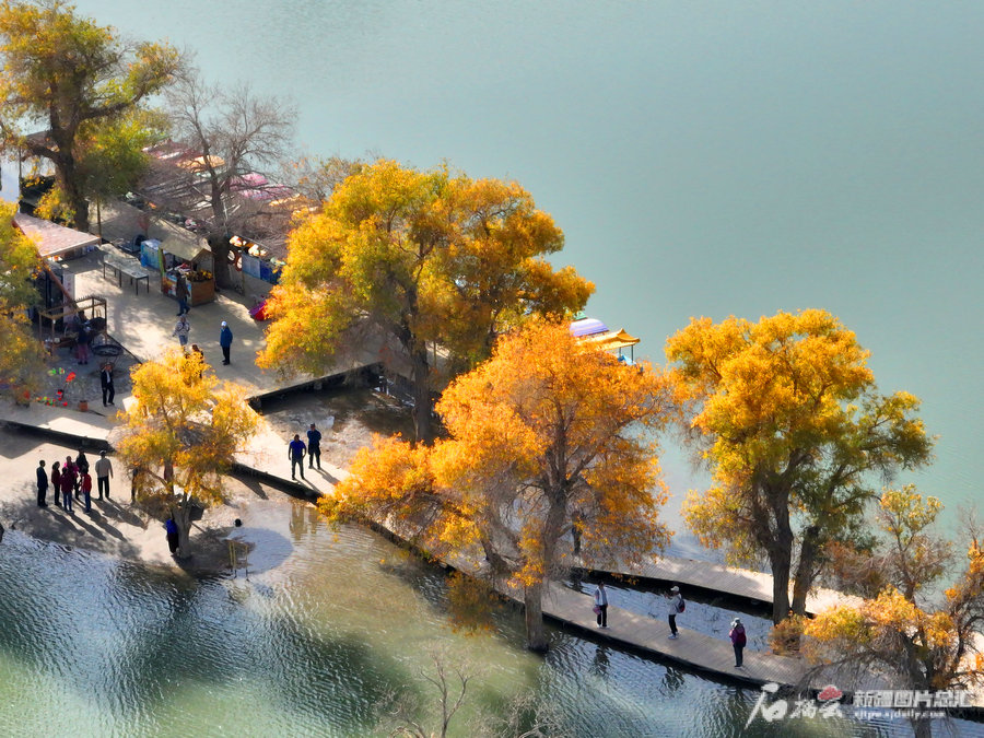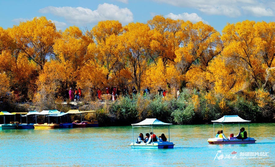 沙雅县沙雁洲景区,在塔河两岸,金黄的胡杨和泛绿的河水交相辉映。王琦铭 摄