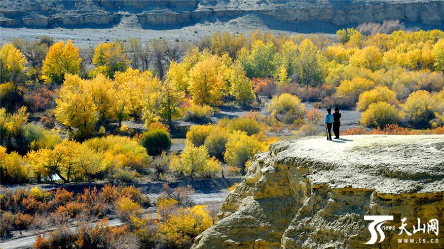 在克拉玛依市乌尔禾区白杨河大峡谷,游客在观赏成片的金色胡杨。闵勇 摄