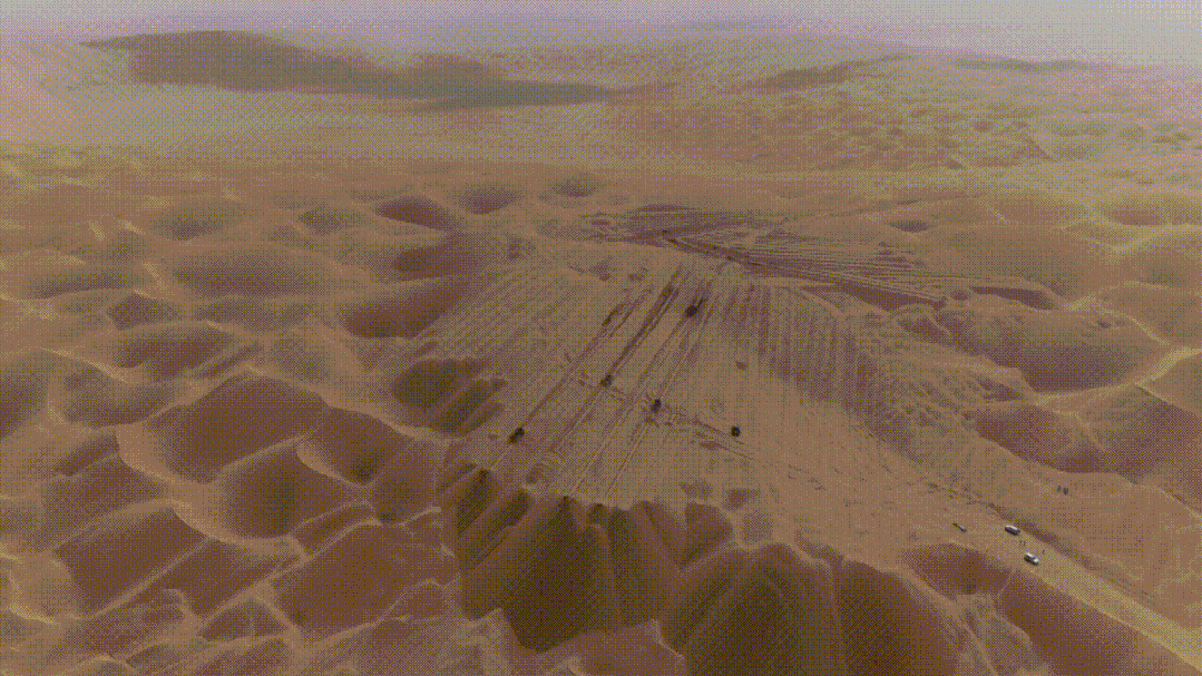 首道难关:沙山、洼地。与前两条穿越沙漠的公路相比,修建尉且沙漠公路更难,因为这条公路要经过沙漠东部密集、高大的沙山,越往里越难,这里是以往的“筑路禁区”。整个项目挖填2700万方,推平32处高大沙山,填平28处丘间洼地,最高的一座沙山近百米,用40多台大功率履带式推土机整整推了150天,才彻底把这座最高的沙山削平。平均每公里的挖填方量达到7.5万方,是轮台—民丰、阿克苏—阿拉尔—和田这两条沙漠公路每公里挖方量的三倍。建设这样一条路需要推运沙子约5000万吨,相当于500多个大型航空母舰的吨位。现代“愚公”们在沙漠中将大大小小的沙山夷为平地,推出了一条300多公里长的平整沙基。