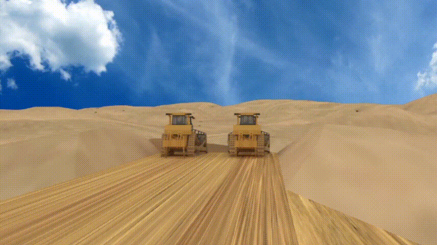 筑路时,采用了“三层推法+皮带机传输”施工法。驾驶推土车重复着推沙、铲沙、运沙的动作,这个过程被称为“剥洋葱”。为了把推下的沙子送到500米外,建设者们设计了一条输送带,一端位于沙山底部,另一端延伸到填方段或弃土场。推土机驾驶员只需要将机斗里的沙子卸在输送带上,就能掉头继续推沙,这就是皮带机传输。