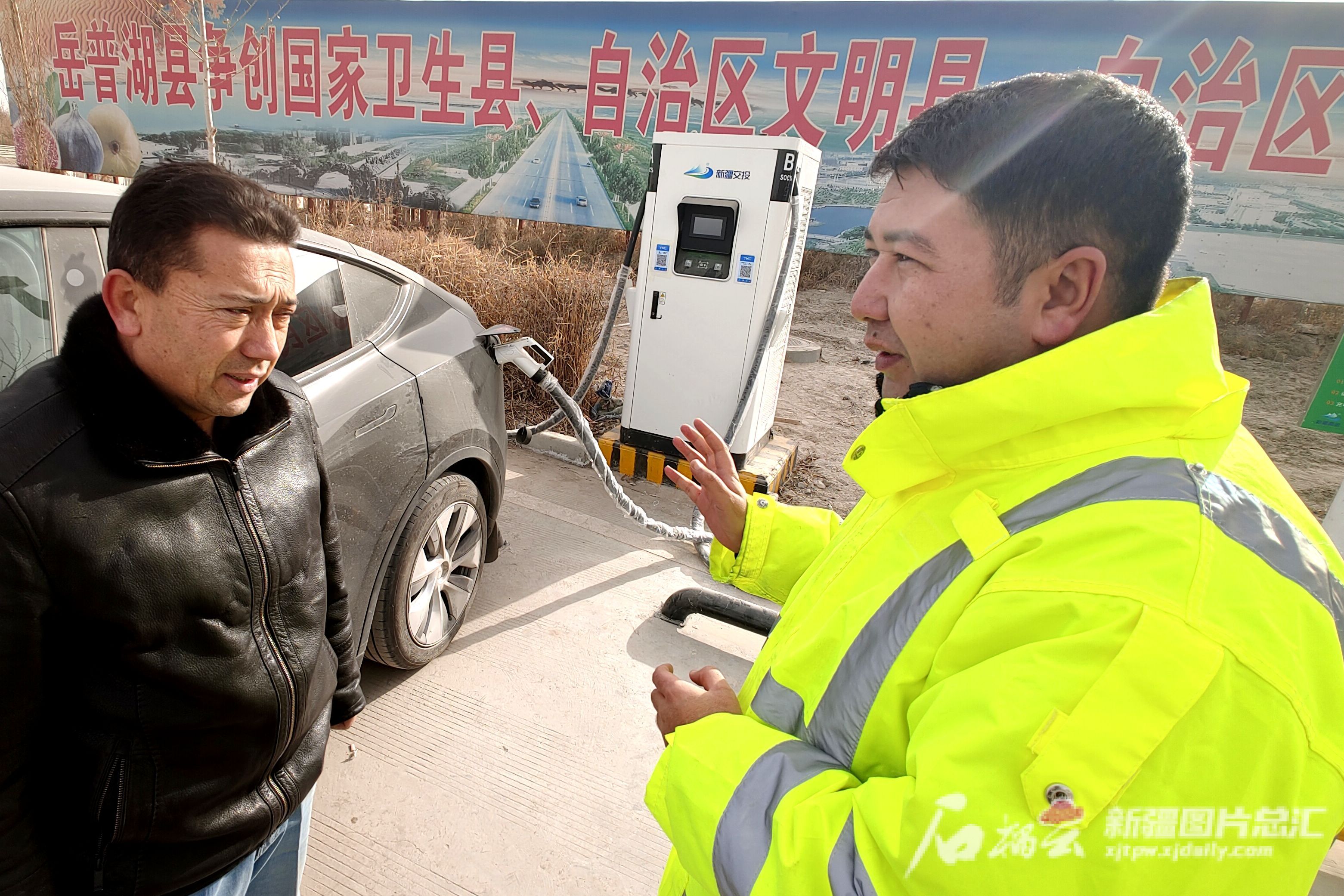12月28日,新疆交投集团喀什分公司岳普湖服务区工作人员木合塔尔江司马·马木提(右)向新能源车主司马义·巴拉提了解充电情况。天山网-新疆日报记者 杨斌摄
