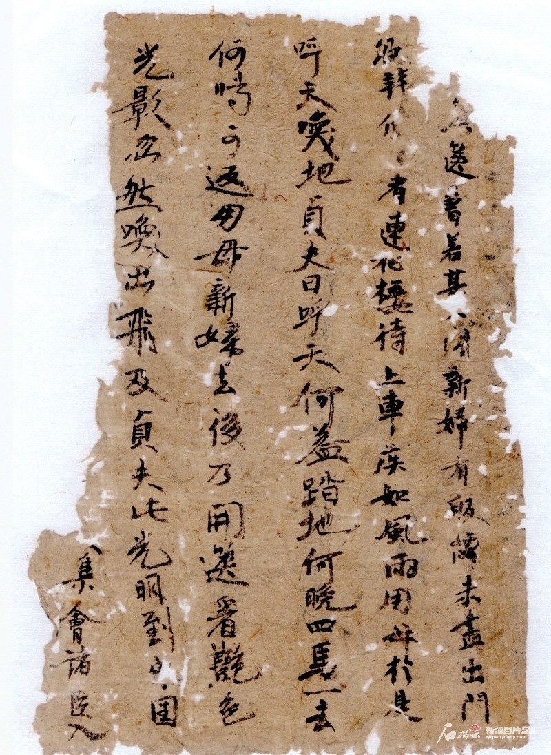 克亚克库都克烽燧出土的《韩朋赋》文书,纸张整体呈长方形,长27.4厘米,最宽处18厘米。左侧边缘见有裁剪痕迹,其余三边参差不齐,左侧及右上角有残缺。纸张呈灰色,有较强韧性。