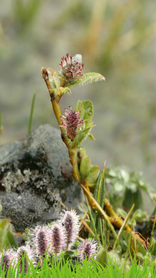 北极柳为杨柳科柳属的植物,花序生于小枝上部,小枝淡黄色,后成棕褐色或栗色,无毛,叶长倒卵形,椭圆形或卵圆形,花期6-7月,果期8月。它生于海拔2004-2800米的高山冻原和北极冻土苔原,可以在北极华氏零下70至20度的环境中很好地生存,是一种耐高寒植物。北极柳伏地生长,且个头矮小,冒出地表3厘米以上的,就算是“参天大树”了。