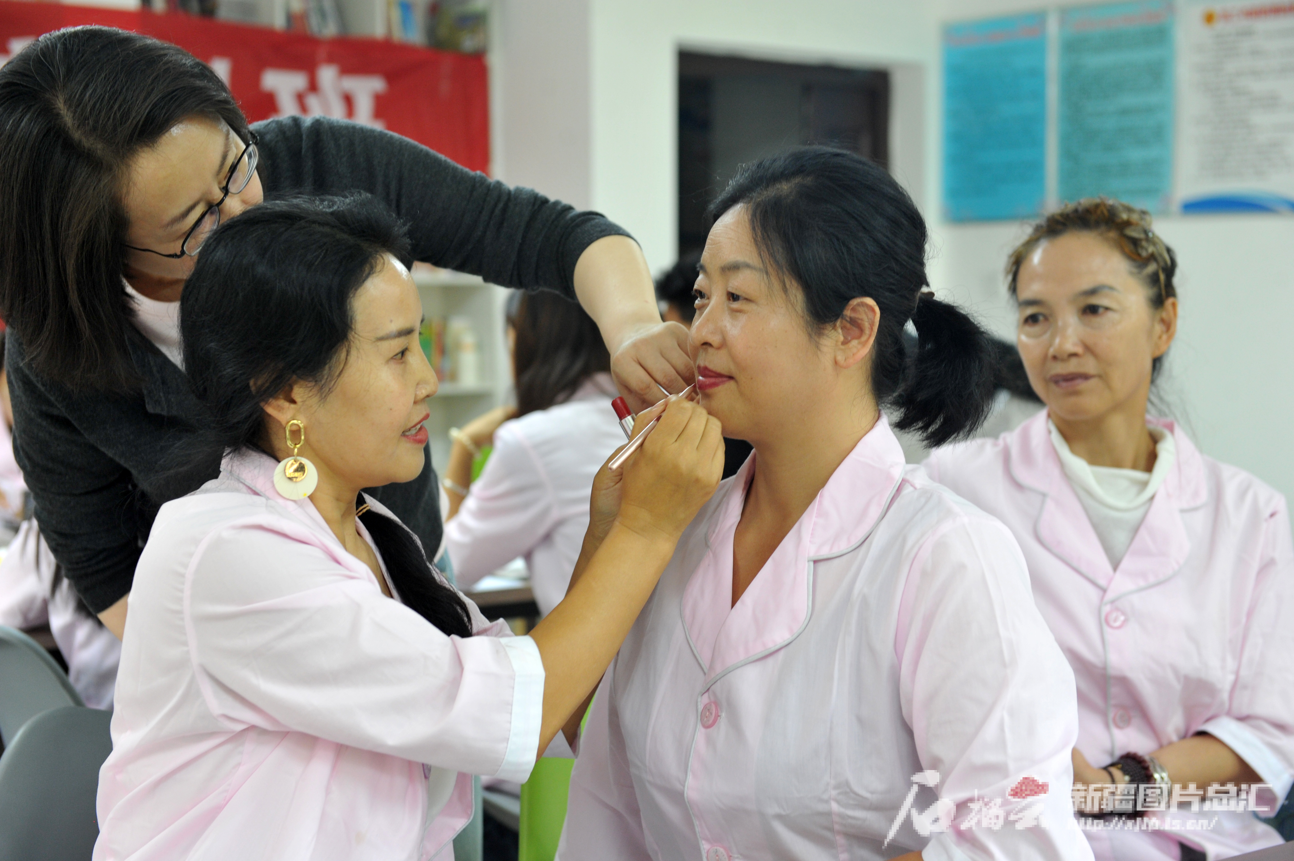 9月3日, 新疆北方职业技能培训学校老师曹艳在职业妆设计培训课上给学员上课。
