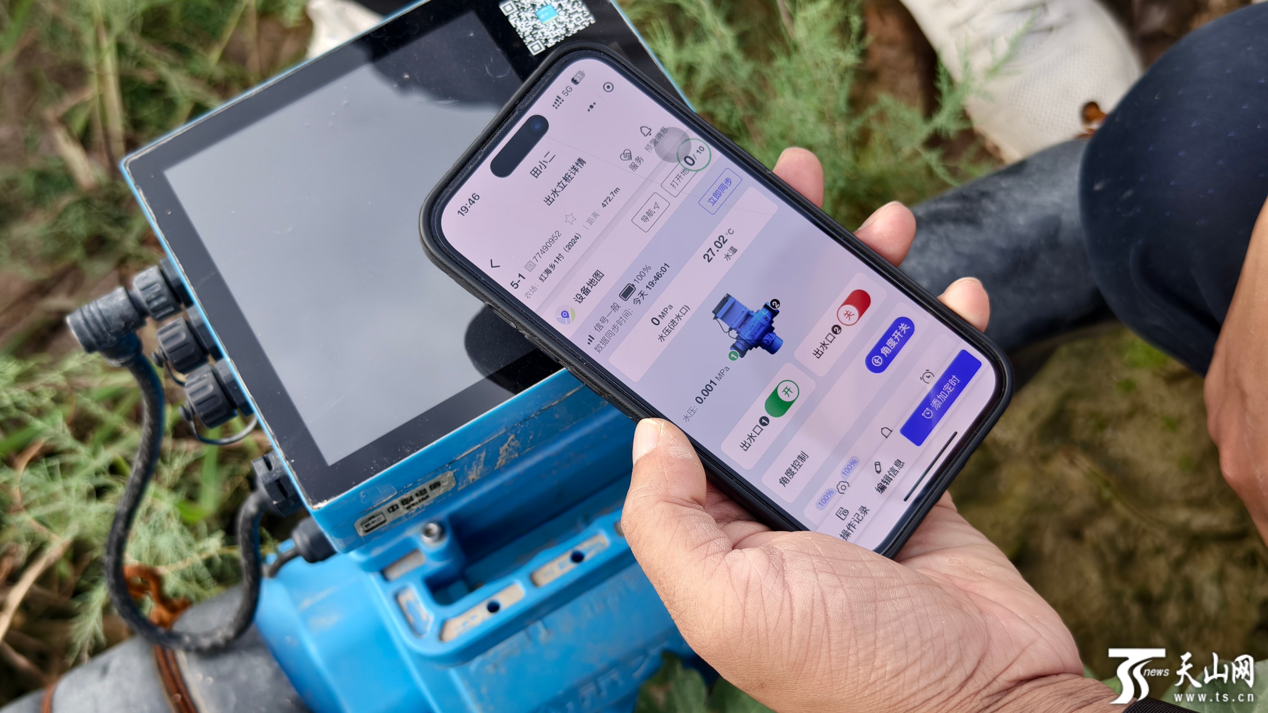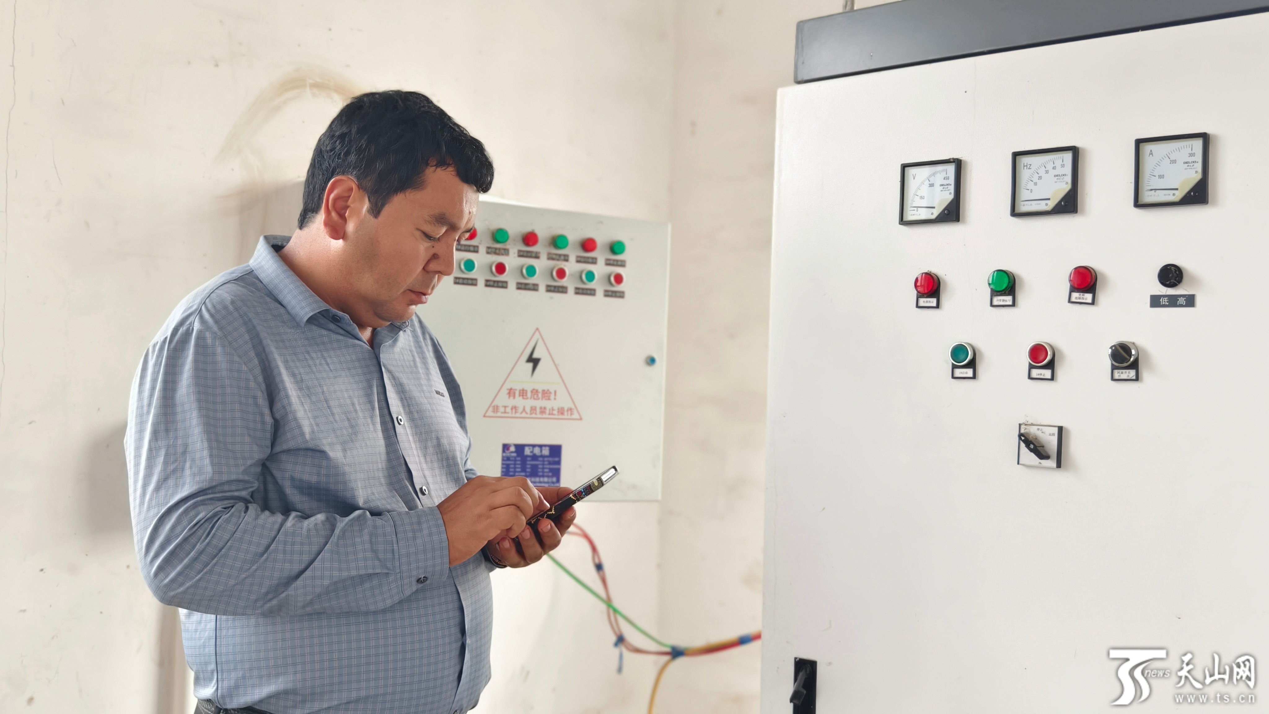 农民依斯坎达尔·麦麦提依敏正在通过手机操作灌溉设备。陈敏 摄