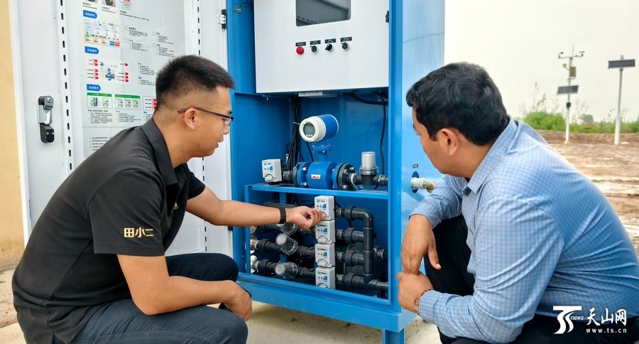 技术人员正在给依斯坎达尔·麦麦提依敏指导农田智能管理设备的使用方法。陈敏 摄
