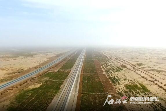 “铁路建设和风沙防护工程同步施工,这样才能保证在铁路建设过程中沙不上道。”新疆和若铁路有限责任公司综合管理部部长陈健说。