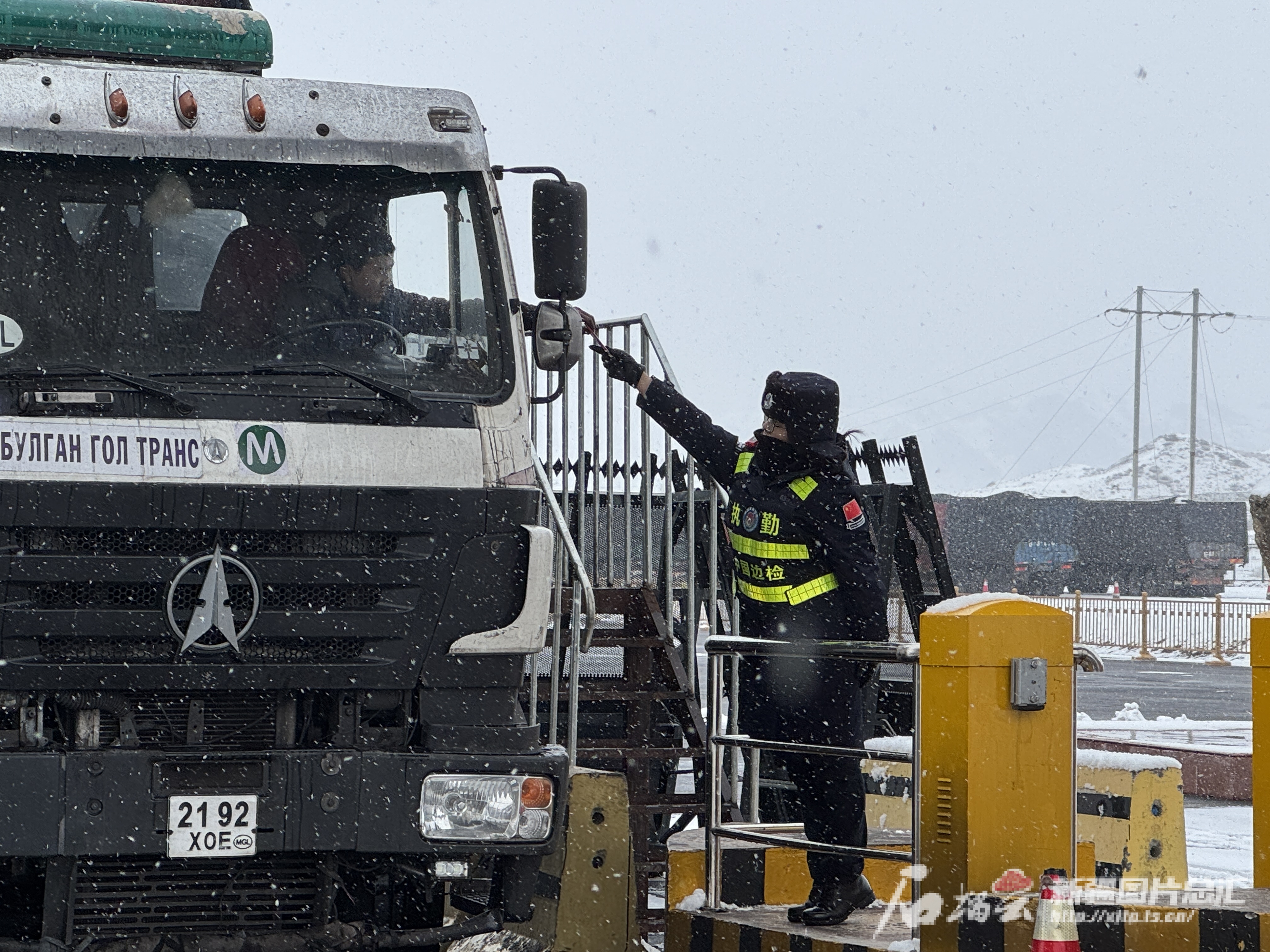 图为塔克什肯边检站执勤民警对出境车辆驾驶员证件进行复检。孟奔奔摄