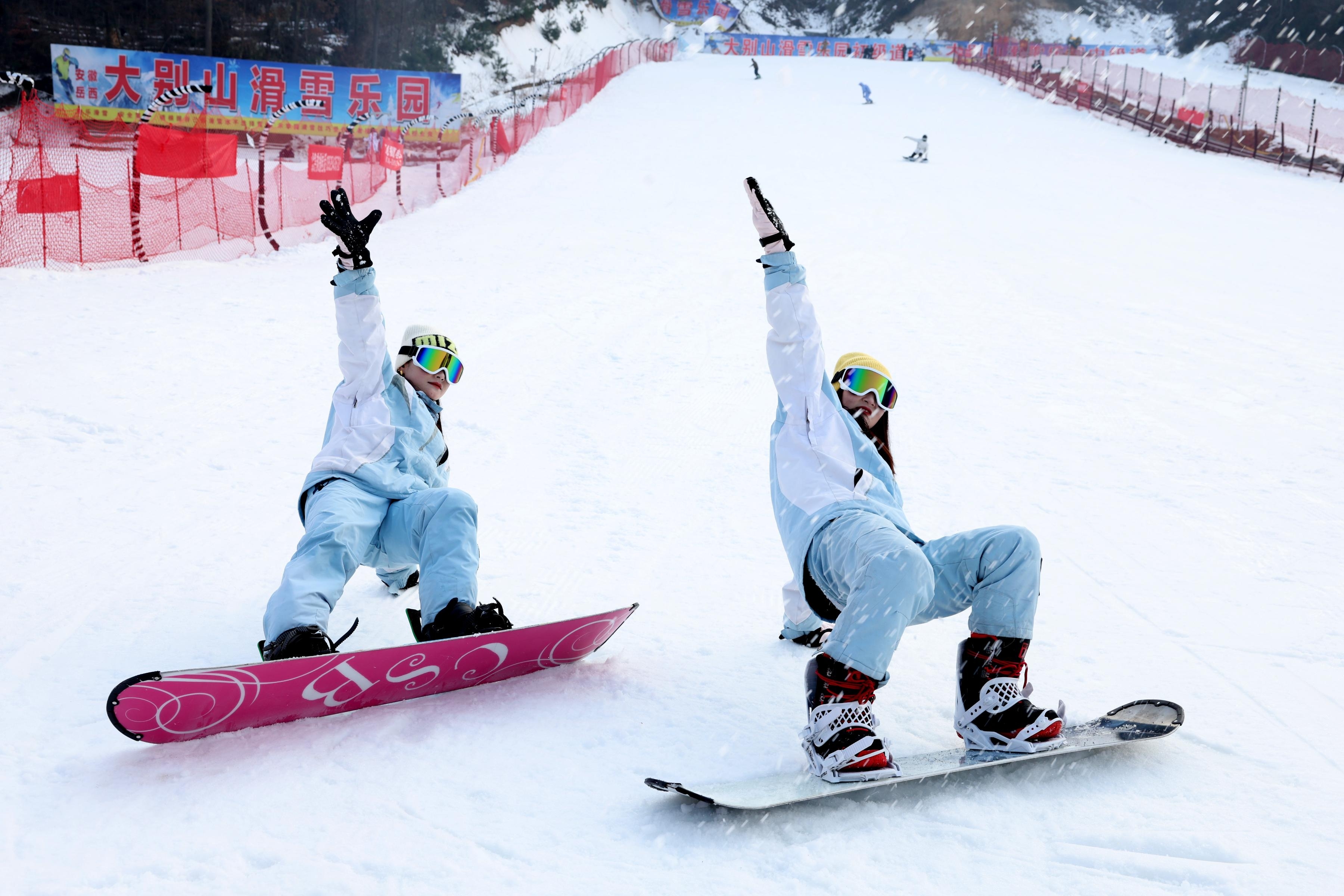 1月3日,在安庆市岳西县石关乡的大别山滑雪乐园,游客打卡拍照。张大岗 摄
