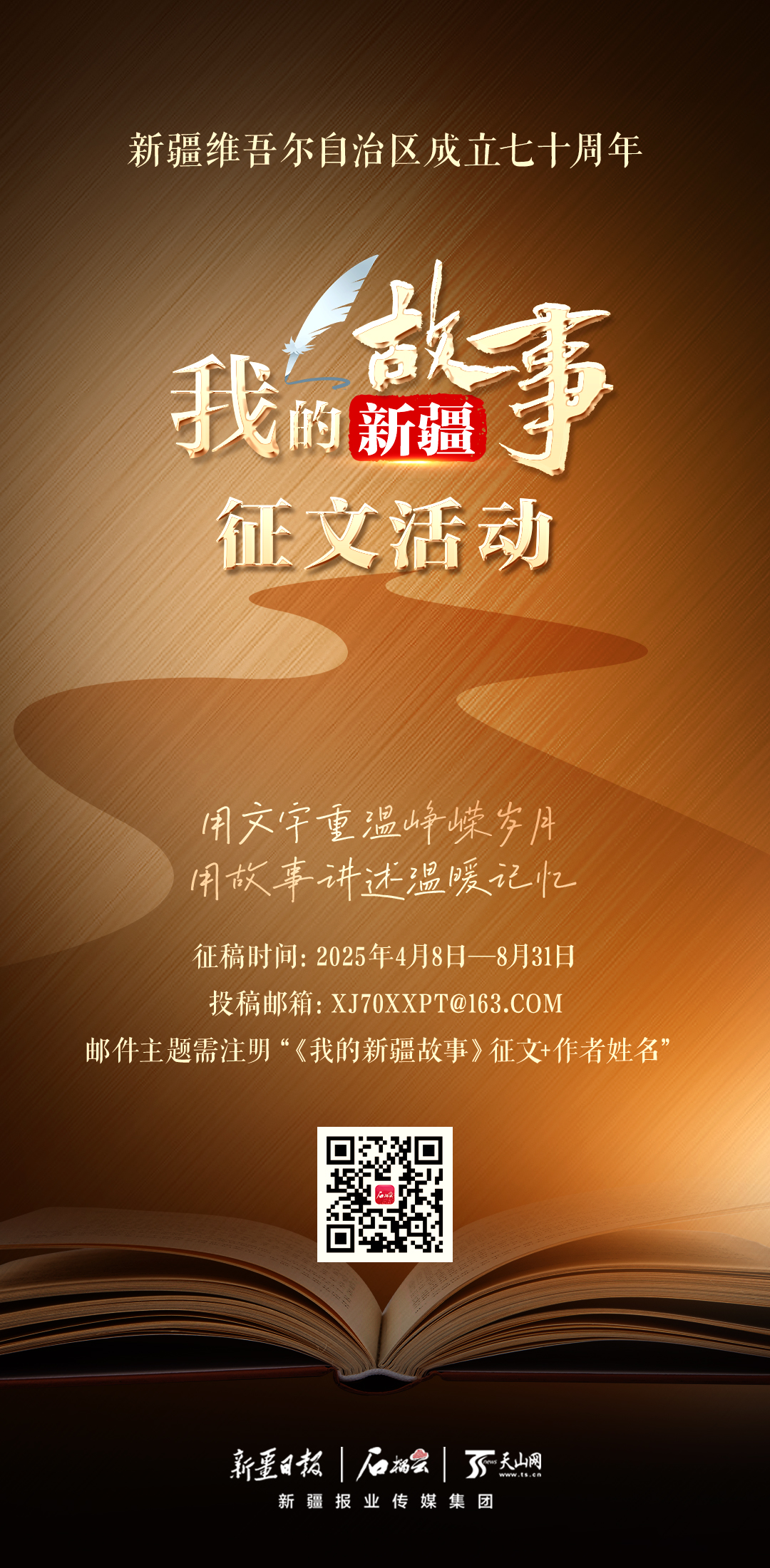 征稿时间即日起至2025年8月31日,投稿指定邮箱:xj70xxpt@163.com。入选稿件将在新疆日报、“学习强国”新疆学习平台、石榴云客户端、天山网等平台刊登。