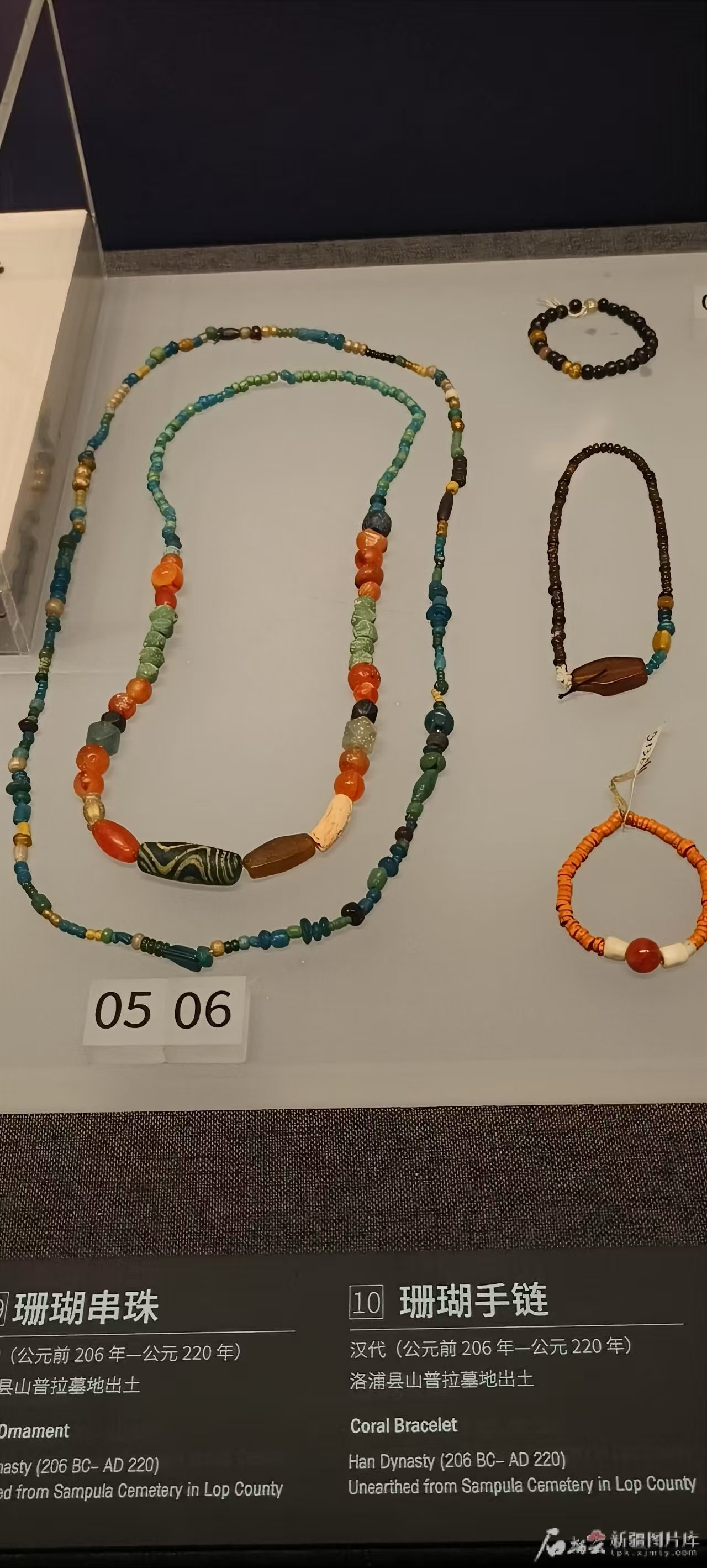 新疆博物馆展出的珊瑚串珠、珊瑚手链。天山网-新疆日报记者 王新红摄