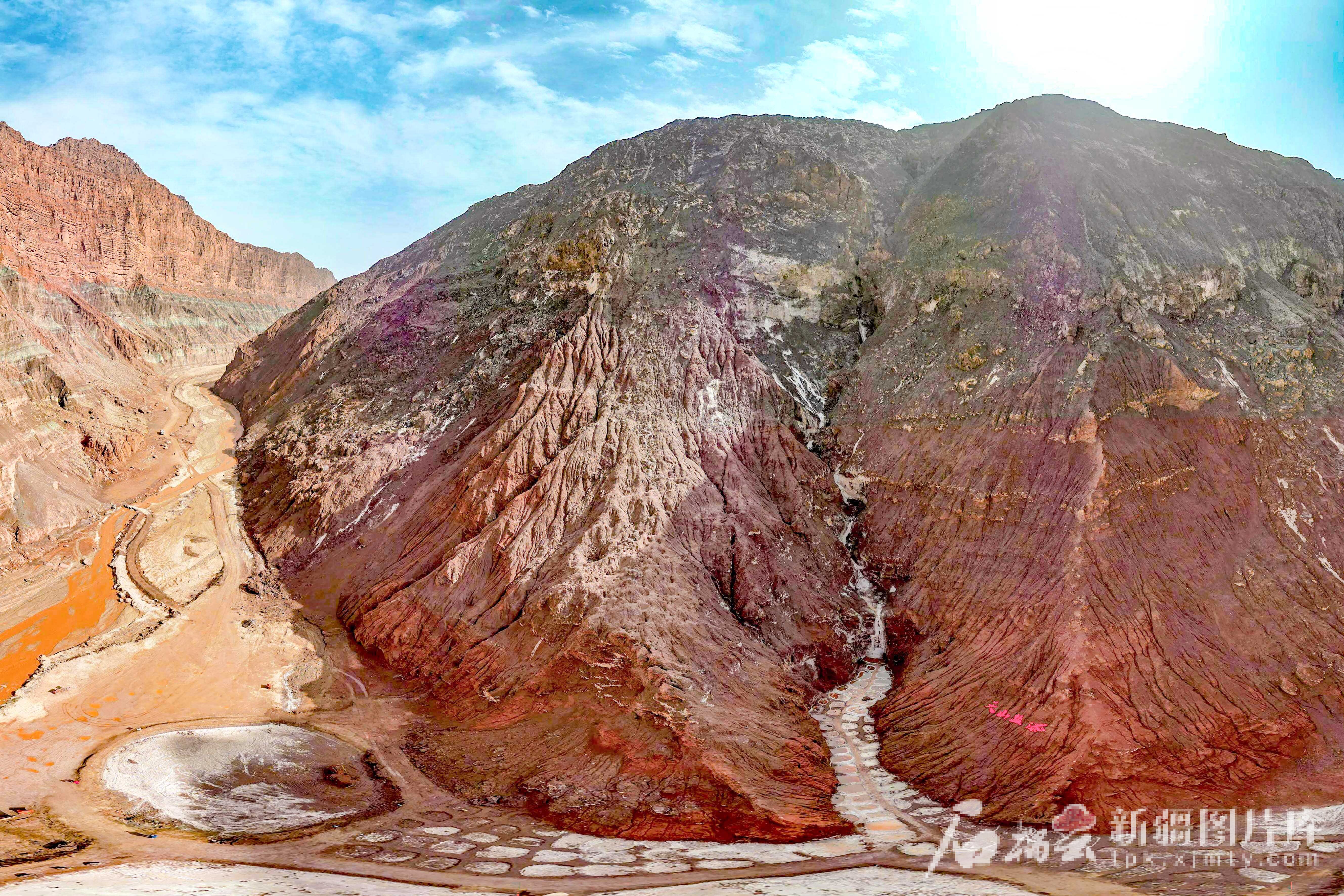 天山网-新疆日报讯(记者蔡增乐摄影报道)夏日的天山托木尔峰洁白如玉,盐溪如冰河般蜿蜒流淌,阳光折射出冰川般的耀眼光芒。5月28日,“新疆农信·农商银行”航拍新疆大型全媒体采风小分队走进这片“地质奇观”,用镜头呈现天山盐瀑的独特地貌,为公众揭开“世界盐谷”的神秘面纱。
