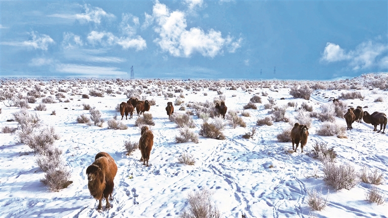 1月18日,木垒县雀仁乡冬窝子,一群骆驼正悠闲地吃着草。 □记者 常谊谊摄