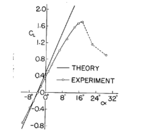 也即,和攻 α 角性关系!这和实验在小攻角下吻合地相当之好(考虑机翼的有限大尺寸,比例系数实际上略低于理论值)。