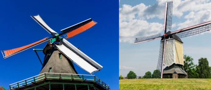 下面我们来看看大风车的情况。实际上,直接利用风的“推力”来进行做工的情况是有的,我们将其称为阻力型风力发电机。一个很像大风车式的具体实现是荷兰四叶式风车: