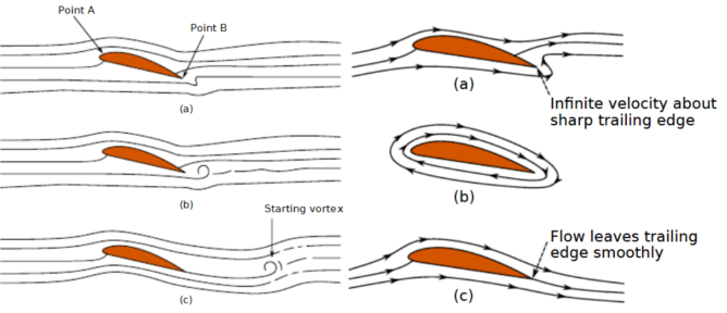 我们来考虑机翼的实际情况,低速翼型通常为圆头尖尾形状,当飞机启动时,上下表面的流动在一起的空气由于速度不同,卷曲了起来,随之向后脱出一个类似于点涡的结构,这就是起动涡。按照亥姆霍兹定律,流体中的净环量应该守恒,也即,机翼上将会产生一个相反方向的环流,这个环流支持了:机翼上方的流速将会比机翼下方的流速高。也支持了库塔条件的成立:即气体在尖尾处平滑离开。有了这个条件,我们可以求解一定条件下的势流方程。