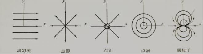 首先考虑一个简单的情况:不可压缩流体中,对于流体中的圆柱这样的简单情形,解可以表示为均匀流、点源、点汇、偶极子等的叠加。