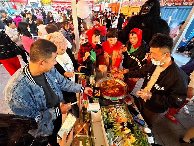 活动现场,群众在商户摊位前品尝火锅。 □记者 马菲阳摄