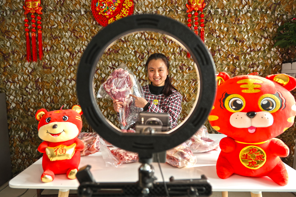 “大家好,欢迎来到我的直播间,我们家的羊吃的是天然碱草,喝的是天山融化的雪水,羊肉无膻味,鲜嫩味美口感好。需要备年货的家人们抓紧时间下单噢……”春节来临之际,记者来到六运湖农场寿娟羊肉店,看到经营户赵寿娟正在线上忙着推介自家的羊肉。
