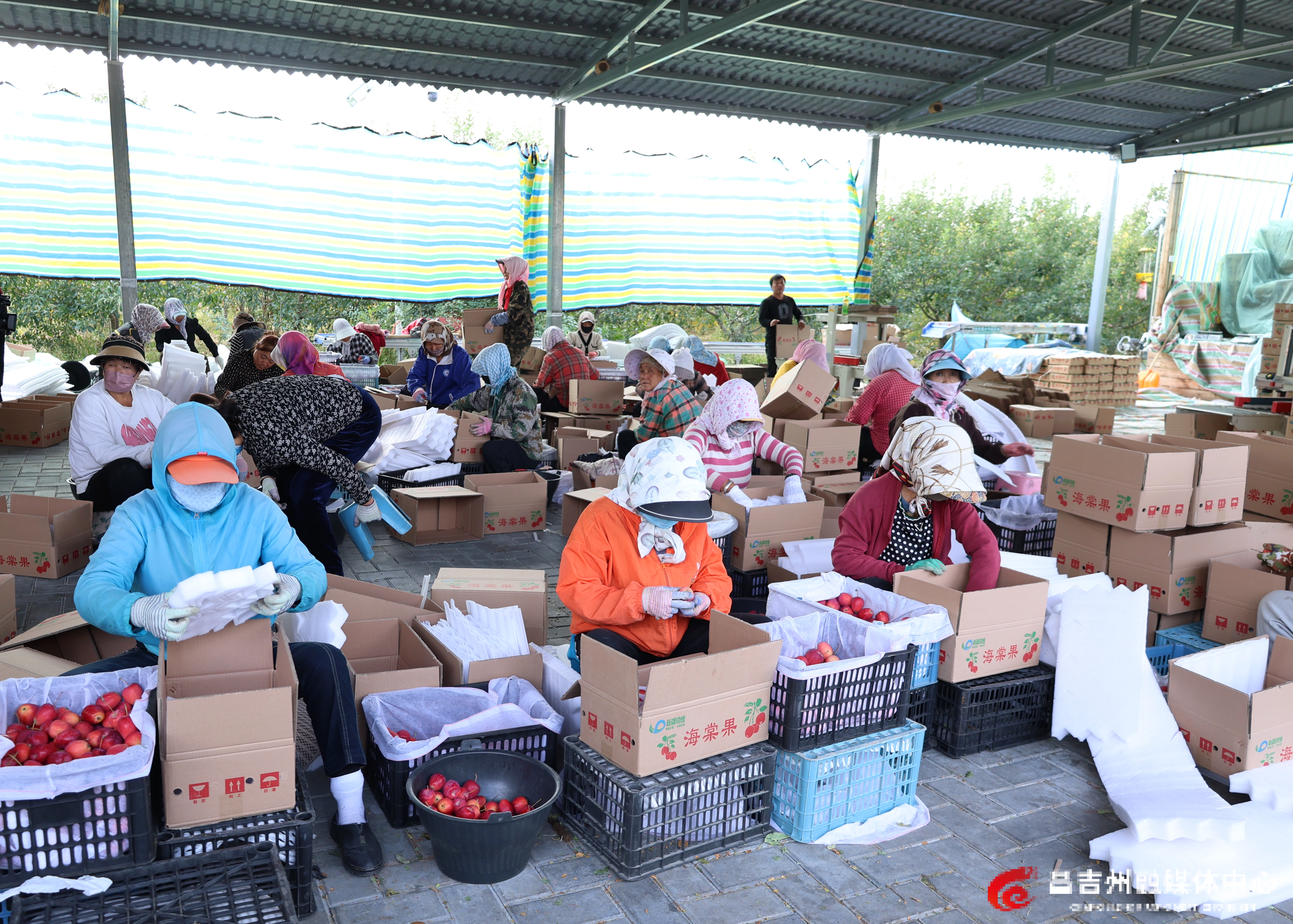 9月17日,在玛纳斯县包家店镇黑梁湾村的香妃海棠果种植基地,果农们忙着挑选香妃海棠果。记者付小芳 摄